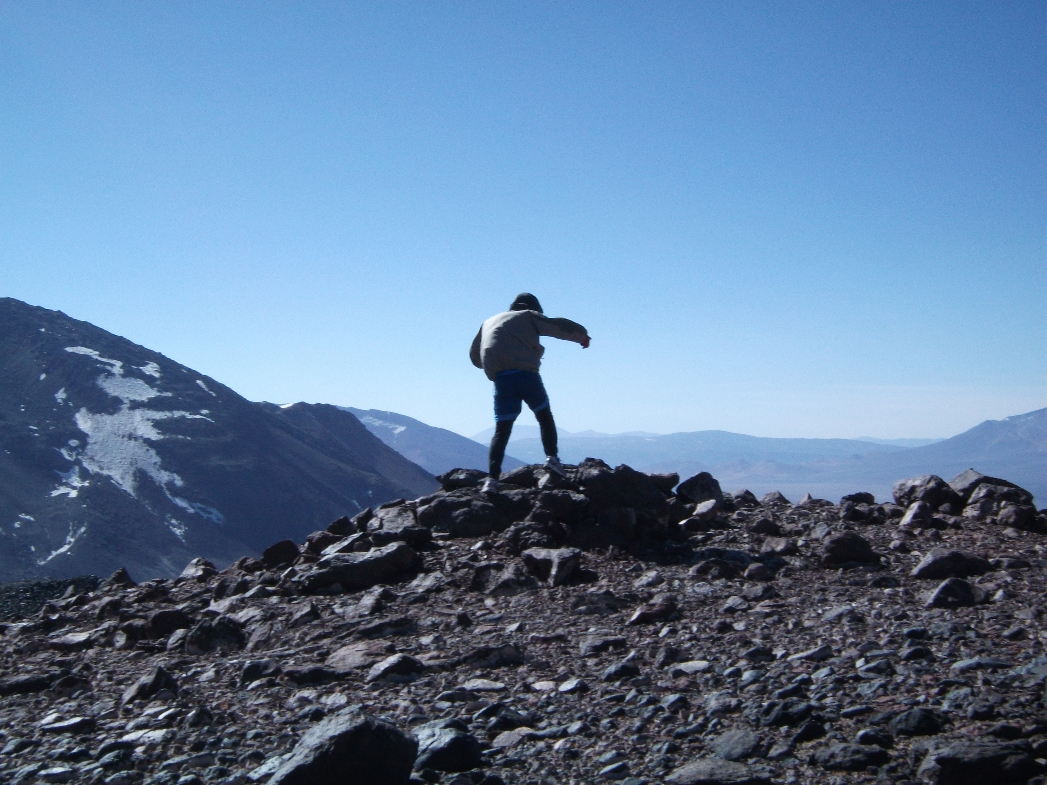 …there is a jarring absence of other life. There are no vicuñas or guanacos [llamalike animals that live as high as 15,000 feet]; no birds in the sky, even if just migrating; no vermin; no shrubs, lichens, or mosses; no insects, not even ones blown astray by the terrain-scouring winds; not even the wee little ice worms eke out a humbled existence here. Everything is dead, and the zone of deadness expands for kilometer upon profound kilometer. This is obviously not intended habitat for humans, physically or psychologically…